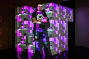 Við smíðum sviðsmyndir og vörpum þrívíðri grafík á yfirborð þeirra.